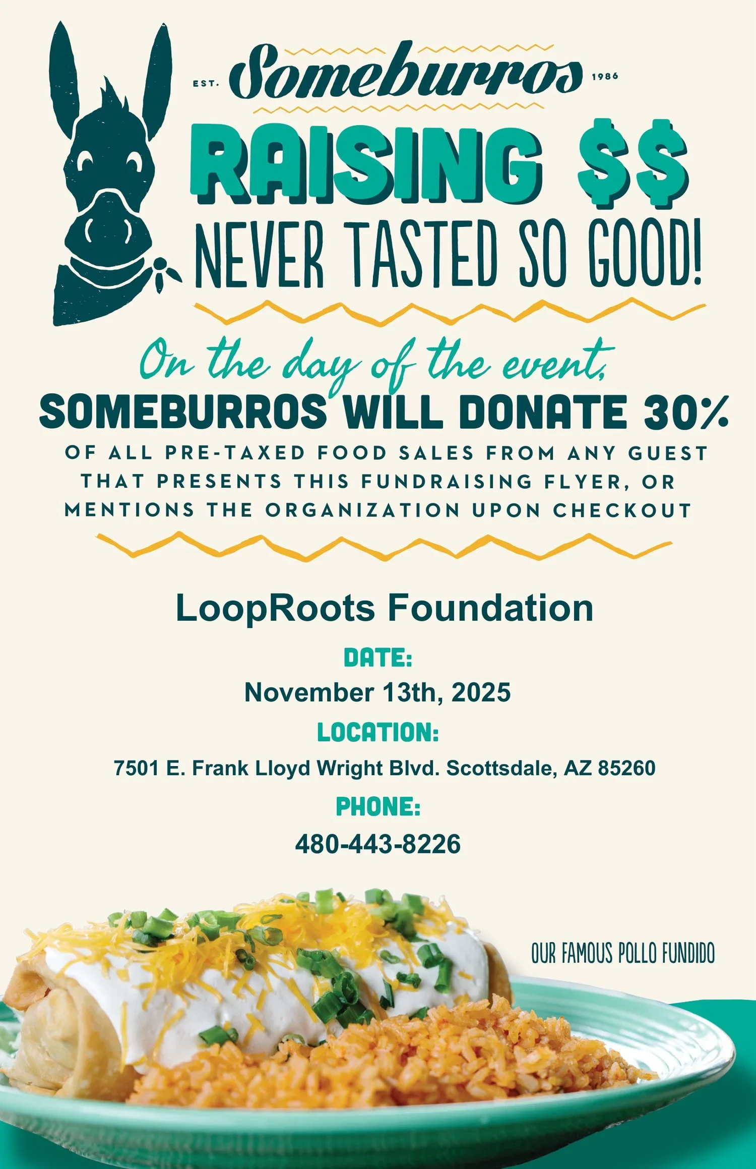Join us for a delicious way to give back! On Thursday, November 13th, dine at Someburros in Scottsdale and help support the mission of LoopRoots Foundation.